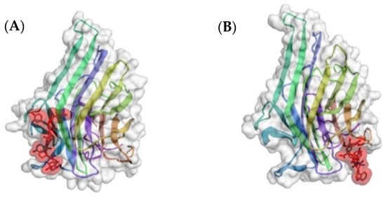 Binding of the peptide MYWYPY to ConA (accession no. 5YGM) as predicted by CABS-Dock. (A) A model of the peptide bound to the left side of the Man binding site (Model 2: RMSD = 5.621 Å; ΔG′ = −43 kJ/mol). (B) A model of the peptide bound to the right side of the Man binding site (Model 4: RMSD = 5.997 Å; ΔG′ = −43 kJ/mol). The peptide is shaded in red.