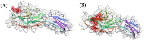 In silico comparison of predicted binding of peptides (A) ARLPR (RMSD = 2.331 Å, ΔG′ = −46.4 kJ/mol) and (B) NPSHPLSG (RMSD = 2.848, ΔG′ = −45.1 kJ/mol) to Siglec-7 (accession no. 1O7V). Modeling was performed with CABS-Dock. Peptides are shaded in red.