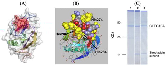 (A) In silico docking of an arm of sv6D (NQHTPR) to human CLEC10A (accession no. 6PY1, RMSD = 1.343 Å, ΔG′ = −37 kJ/mol) with CABS-Dock. The peptide is enclosed in red shading. (B) The structure in (A) was downloaded into ArgusLab. The position of sv6D in the binding pocket is shown after additional molecular dynamics. The peptide is colored (carbon, grey; nitrogen, blue; oxygen, red) while the binding site is yellow. The positions of His274, His284, and His286 of the binding site are indicated. (C) A lysate of human monocyte-derived DCs was incubated with (1) mouse anti-human CLEC10A, which was recovered with magnetic beads coated with protein A; (2) biotinylated sv6D; or (3) biotinylated svL4, which were recovered with magnetic beads coated with streptavidin. Proteins were eluted from the beads and subjected to electrophoresis. Molecular mass markers are indicated for IgG heavy chain (50 kDa), IgG light chain (25 kDa), and a streptavidin C1 subunit (13.6 kDa). The top band is an instrument marker.