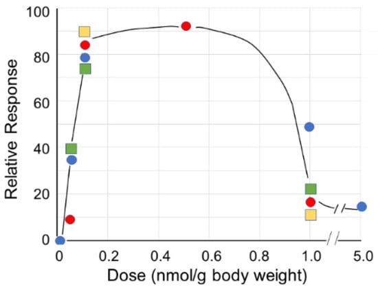 An alternate view of CLEC10A function emerged from dose–response studies of treatment of murine models of ovarian cancer and glioblastoma with peptides (Figure 6 and Figure 7). The response elicited by a receptor is often determined by the degree of occupancy by a ligand. High occupancy, as provided by high ligand concentrations or the saturation binding of an antibody to the receptor, causes tolerance. This response results from activation of a signal transduction pathway that leads to phosphorylation of the transcription factor CREB to produce IL-10. In contrast, low occupancy activates a pathway that leads to NF-κB and production of IL-12 [48]. Studies of the interactions of ligands and receptors as a function of occupancy indicated that at low ligand/receptor ratios (5 to 20% receptor occupancy), receptor cross-linking is favored, and the ligand binds with high avidity because of favorable binding entropy. However, cross-linking at high ligand/receptor ratios (greater than 50% receptor occupancy) is less likely, and consequently, the initiation of signaling pathways is weaker [35].