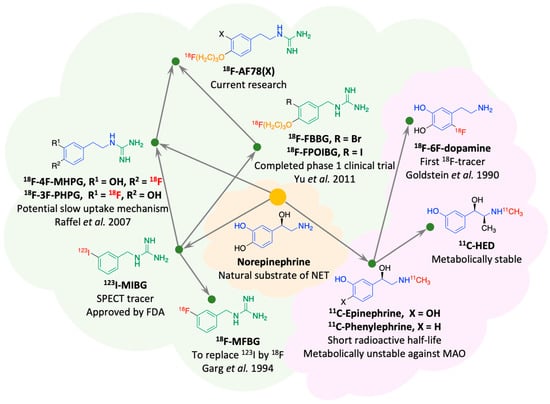 Evolutionary tree for the development of selected radiotracers targeting the norepinephrine transporter (NET), which can be categorized as monoamines (violet cloud) or guanidines (light green cloud) [4,8,9,10,11]. Blue and green represent the shared core structures of the radiotracers, orange represents the common “tail” structure, and red represents radionuclides.