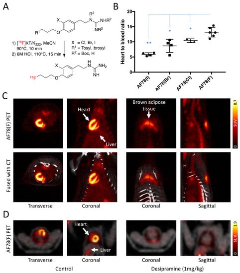 - Chen, X.; Fritz, A.; Werner, R.A.; Nose, N.; Yagi, Y.; Kimura, H.; Rowe, S.P.; Koshino, K.; Decker, M.; Higuchi, T. Initial Evaluation of AF78: A Rationally Designed Fluorine-18-Labelled PET Radiotracer Targeting Norepinephrine Transporter. Mol. Imaging Biol. 2020, 22, 602–611. [Google Scholar] [CrossRef]