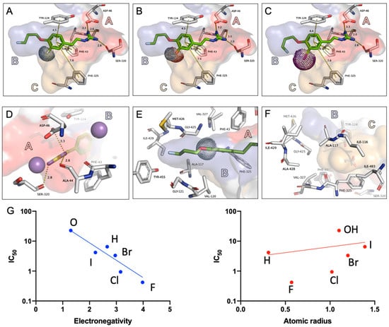 Different substitution pattern of the AF78 series (backbone of the common structure in green) in complex with Drosophila dopamine transporter with NET-like mutations (dDATNET, PDB6M0Z) [23]. The space occupied by the halogen atoms or the phenol function are visualized by dots. The two sodium ions of the transporter are shown as purple spheres out of scale for a better overview. The binding pockets are designated with letters A–C. Distances between the presented tracer and the transporter are shown in Å. The atomic radius of the halogens and the hydroxy group are displayed with dots in A–C. (A–C) Proposed binding mode of AF78(F), (OH) and (I), respectively, bound to the dDATNET. (D) Pocket A interactions of the guanidine moiety with ALA-44, ASP-46, SER-320 and two sodium ions (displayed in purple). (E) Visualization of Pocket B from a top-down perspective, which is surrounded by a group of nonpolar amino acid moieties (GLY-121, VAL-120, MET-426, ILE-429). (F) Amino acids forming the hinge region between Pocket B and C (ALA-117, GLY-425) and the surrounding nonpolar amino acid moieties that form the lipophilic Pocket C (ILE-113, ILE-483, VAL-327, ALA-117, VAL-113, PHE-325). (G) Correlation between NET affinities of cold references obtained from competitive cellular uptake assay and physical properties of the substituents. The IC50 values of the target tracer correlated positively with the electronegativity instead of the size of the meta-substituent on the benzene-ring.