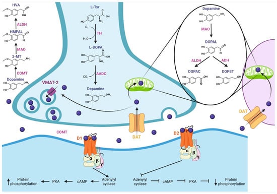 In this section, we describe DA and its pharmacological properties at the molecular level. The synthesis of DA (Figure 1) begins with the hydroxylation of L-tyrosine by the TH enzyme to generate L-3,4-dihydroxyphenylalanine (L-DOPA); then, aromatic L-amino acid decarboxylase (AADC or DOPA decarboxylase) allows the production of cytosolic dopamine [18,19,20]. The DA synthesized in the presynaptic terminal is loaded in synaptic vesicles by vesicular monoamine transporter 2 (VMAT-2); subsequently, DA is released to the synaptic cleft. Next, the Na+-dependent dopamine transporter (DAT), localized in neurons and glial cells, reuptakes the neurotransmitter [18]. DA is recycled into synaptic vesicles or degraded by specialized enzymes [21], where its catabolism takes place. In presynaptic terminal and glial cells, the monoamine oxidase (MAO) enzyme, localized in mitochondria, breaks down DA through oxidative deamination, producing 3,4-dihydroxyphenylacetaldehyde (DOPAL); in turn, aldehyde dehydrogenase (ALDH) converts DOPAL to carboxylic acid 3,4-dihydroxyphenylacetic acid (DOPAC) by oxidation, or alcohol dehydrogenase (ADH) reduces DOPAL to 3,4-dihydroxyphenylethanol (DOPET) [20,22]. The catechol O-methyl-transferase (COMT) enzyme, localized in the synaptic cleft, catalyzes the methylation of dopamine to 3-methoxytyramine (3-MT), which is a MAO substrate that forms 3-methoxy-4-hydroxyphenylacetaldehyde (HMPAL). Finally, the ALDH enzyme catalyzes HMPAL to generate homovanillic acid (HVA), which is the main end-product of DA degradation [20,22,23]. At the post-synapse, DA binds to D1-like and D2-like receptors, which are G-protein-coupled channels [24]. The D1-like receptor activates the Gαs/olf subunit protein that stimulates the adenylyl cyclase (AC) protein; then, it generates the cyclic adenosine monophosphate (cAMP) second messenger, which activates protein kinase A (PKA), resulting in target action and increasing protein phosphorylation. On the other hand, the D2-like receptor, by activating the Gαi/o subunit, inhibits the effector protein AC, inhibiting the cAMP second messenger and, thereby, PKA, generating a decrease in protein phosphorylation [18,24,25,26].