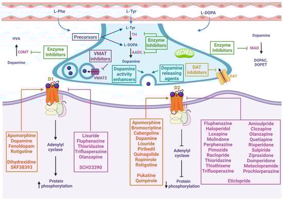 DA enzyme inhibitors can be classified into DA synthesis inhibitors and DA degradation inhibitors. There are three kinds of dopamine synthesis inhibitors: (1) TH inhibitors (for example, 3-iodo-tyrosine and metyrosine), which are able to inhibit TH activity, the rate-limiting enzyme in DA biosynthesis [90]; (2) phenylalanine hydroxylase inhibitors (for example, 3,4-dihydroxystyrene), which inhibit the enzyme that converts phenylalanine to tyrosine [91]; and (3) DOPA decarboxylase inhibitors, which block the biosynthesis of L-DOPA to DA. Examples of these inhibitors are benserazide and carbidopa, commonly used in combination with levodopa. Since they can hardly cross the blood–brain barrier, they prevent the formation of dopamine in extracerebral tissues, minimizing the occurrence of extracerebral side effects [92,93].