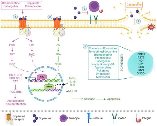 Simplified and integrated mechanisms of dopamine and its agonist, as antioxidant and anti-inflammatory molecules, in various physiological processes. (1) The binding of dopamine and some agonist drugs with its receptor activates the PI3K/AKT or ERK signaling pathway, resulting in Nrf2 translocation to the nucleus, inducing the expression of HO-1 and antioxidant genes (pink pathway). (2) The activation of AC/PKA inhibits NF-κB, generating a decrease in proinflammatory cytokine expression and the protein complex NLRP3 inflammasome, thus diminishing the apoptotic process (green pathway). (3) Dopamine attenuates the chemoattractant effect of integrins and adhesion molecules. (4) Cabergoline and dopamine inhibited the peroxidation of brain phospholipids and reacted with free radicals. (5) Some drugs showed scavenger capacity and protection against ROS accumulation (cyan box).