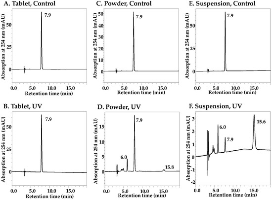 HPLC chromatograms of SPL tablets, powders and suspensions with and without UV irradiation for 24 h: (A) tablets, (B) UV-irradiated tablets, (C) powders, (D) UV-irradiated powders, (E) suspensions and (F) UV-irradiated suspensions. Detection wavelength: 254 nm.