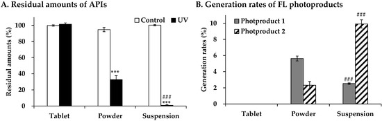 The residual amounts (%) of APIs and the generation rates (%) of two FL photoproducts in tablet samples, powder samples and suspension samples are summarized in Figure 4. Residual amounts of APIs in UV-irradiated powders and suspensions (32.76 ± 4.88% and 0.79 ± 0.74%, respectively) were significantly less than those of the control samples (94.69 ± 2.52% and 100.22 ± 0.83%, respectively). Similarly to the HPLC chromatogram, residual amounts of APIs were not influenced by UV irradiation when tablet samples were irradiated. These results indicated that changing the dosage form of SPL tablets to powders and suspensions decreases the photostability because of the loss of a film coating and the enhancement of a light emission efficiency to their APIs, as shown in our previous reports [29]. It is possible that the crushing of SPL tablets for the improvement of medication compliance in a clinical situation might result in the decrease in its beneficial effect when SPL powders are packaged and stored in a place where they are exposed to sunlight.