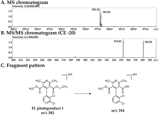 The m/z value of protonated FL photoproduct 1 was 382.20 and 384.20 as shown in Figure 6A. FL photoproduct 1 has also two chlorine atoms due to the detection of isotopic ion peaks. The m/z value of FL photoproduct 1 was smaller than that of FL by 2, which corresponds to the molecular weight of a hydrogen molecule. It is suggested that FL photoproduct 1 is a pyridine derivative of FL, which is chemically 3-ethyl 5-methyl 4-(2,3-dichlorophenyl)-2,6-dimethylpyridine-3,5-dicarboxylate. In the MS/MS spectrum, one fragment ion (m/z 354.00) was detected (Figure 6B) and seemed to be generated by the elimination of an ethyl group (Figure 6C). It is indicated that the oxidation of a dihydropyridine ring resulted in the decrease in its polarity because FL photoproduct 1 eluted faster than FL as shown in Figure 2, the same as our previous report [3]. In addition, a pyridine derivative showed no characteristic absorption among 300 to 400 nm, which differs from FL as shown in Figure 3B.