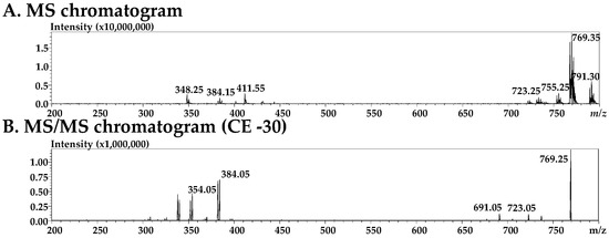 MS and MS/MS spectra of FL photoproduct 2 in UV-irradiated SPL suspensions, and proposed fragment pattern: (A) MS spectrum of the peak of FL photoproduct 2, (B) MS/MS spectrum of the peak of FL photoproduct 2 (m/z 769), (C) proposed fragment pattern of FL photoproduct 2.