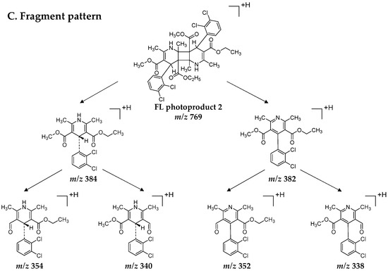 As for FL photoproduct 2, the molecular ion peak of a protonated FL photoproduct 2 (m/z 769.35) was detected in the MS chromatogram (Figure 7A). Several isotopic ion peaks were detected, and their detection pattern was different from that of FL and FL photoproduct 1. Its MS/MS chromatogram (Figure 7B) showed that FL and FL photoproduct 1 were detected as fragment ions of FL photoproduct 2, whose m/z values were 384.05 and 382.05, respectively, and their additional fragment ions were generated by the elimination of a methoxy group and an ethoxy group. It is postulated that the structure of FL photoproduct 2 is an FL dimer which is chemically 3,7-diethyl 4a,8a-dimethyl 4,8-bis(2,3-dichlorophenyl)-2,4b,6,8b-tetramethyl-1,5,8,8b-tetrahydrocyclobuta [1,2-b:3,4-b′]dipyridine-3,4a,7,8a(4H,4bH)-tetracarboxylate (Figure 7C). FL dimer has four chlorine atoms, so several isotopic peaks are observed in the MS chromatogram as shown in Figure 7A. Several minor fragment ions (m/z 737.15, 723.05 and 691.05, respectively) were also designated as product ions generated by the loss of a methoxy group, ethoxy group and both groups. UV spectral analysis clarified that FL photoproduct 2 showed no characteristic absorption among 300 to 400 nm, which is different to FL (Figure 3C), indicating that a photodimerization induced the loss of a dihydropyridine moiety the same as FL photoproduct 1.