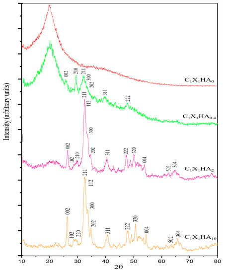 The diffractograms for the C1X1HA10 formulation and HA powder itself (obtained by the International Center for Diffraction Data 00-009-0432, [31]) confirm that a product with low to medium crystallinity and similar to the mineral phase of human bone was obtained. The characteristic peaks of the crystalline structural plane of the HA phase, comprising the eight main peaks of angular position between 25° and 50°, were observed [32]. These results suggest that the HA powder incorporation into the C-X polyelectrolyte complex does not change the HA crystallinity and phase characteristics, despite the use of acetic acid for chitosan dissolution [29]. Neves et al. [22] found results similar to those described in this work for porous scaffolds composed of C-X and HA. In that work, the researchers also observed the crystalline phase of HA in the scaffolds. An amorphous phase related to C-X was also detected. In Figure 1, the amorphous phase between 12° to 25° decreased with the increase of HA concentration.