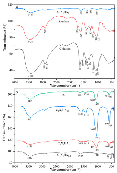 Fourier transform infrared spectra obtained for: (a) the chitosan-xanthan membrane without hydroxyapatite (C1X1 HA0) and the pristine polysaccharides chitosan and xanthan gum, and (b) chitosan-xanthan membrane formulations incorporating HA at different concentrations and pristine HA.
