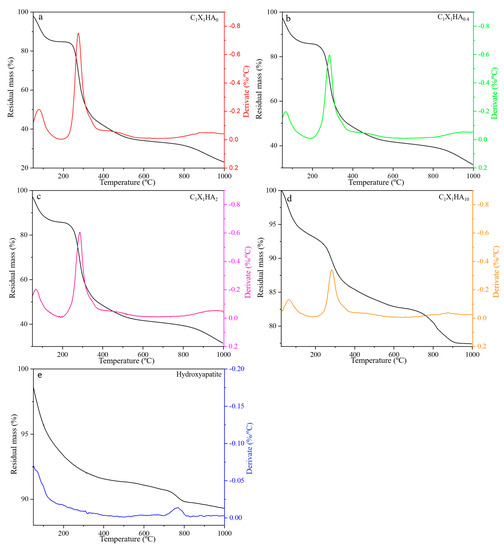 Thermogravimetric analysis and its derivative for the membrane formulations: (a) C1X1HA0; (b) C1X1HA0.4; (c) C1X1HA2; (d) C1X1HA10; and (e) pristine hydroxyapatite.