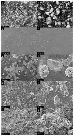 SEM of HA powder and membranes surface at different magnifications. (a,b) Aspect of the HA powder obtained in the synthesis process. Aspect of the surface of the different membrane formulations: (c,d) C1X1HA0; (e,f) C1X1HA0.4; (g,h) C1X1HA2; (i,j) C1X1HA10. The black and white arrows highlight particular characteristics observed during the analysis of the results.