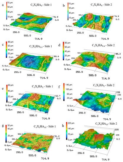 The roughness of the side 1 surface of the C1X1HA0.4 and C1X1HA2 formulations is comparable to that of C1X1HA0. In addition, the comparison between both sides of the same formulation showed that Rq is significantly different only for the C1X1HA2 and C1X1HA10 formulations, which presented the highest roughness on side 2 (rougher). Similar results were obtained by Bombaldi de Souza et al. [48], with an Rq value of 6.24 ± 1.39 µm for dry C-X membranes.