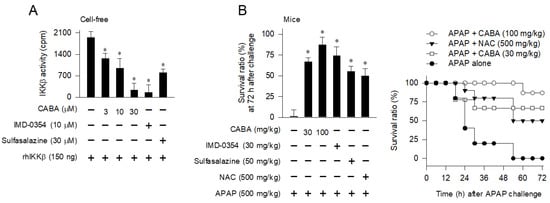 Effects of IKKβ inhibitors on IKKβ activity and APAP-induced mortality. (A) Catalytically active rhIKKβ was treated with CABA for 10 min in cell-free reactions. In vitro kinase activity was determined by the incorporation of [32P] onto MBP as exogenous substrate from [γ-32P]-labeled ATP, and represented as count per min (cpm). * p < 0.05 vs. IKKβ alone. (B) C57BL/6 mice were treated with CABA at 1 h after APAP overdose. Survival ratio was examined until 72 h. Three independent tests were performed with 9 to 11 mice per group. * p < 0.05 vs. APAP alone.