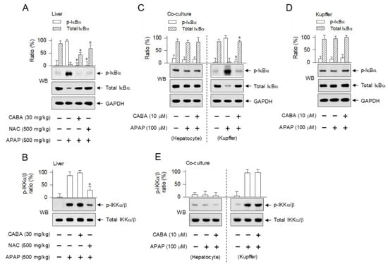 Effect of CABA on APAP-induced activation of IKKβ. (A,B) C57BL/6 mice were treated with CABA at 1 h after APAP overdose. Liver lobules were biopsied at 15 h. (C,E) Co-culture between primary hepatocytes and Kupffer cells was pretreated with CABA for 2 h and stimulated with APAP for 12 h in the presence of CABA. (D) Primary Kupffer cells were pretreated with CABA for 2 h and stimulated with APAP for 12 h in the presence of CABA. Protein extracts were resolved on an SDS-acrylamide gel by electrophoresis, and subjected to Western blot (WB) analysis with anti-p-IκBα, anti-IκBα, or anti-GAPDH antibody (A,C,D) and anti-p-IKKα/β or anti-IKKα/β antibody (B,E). Ratio (%) represents relative intensity of signals in WB. * p < 0.05 vs. APAP alone.