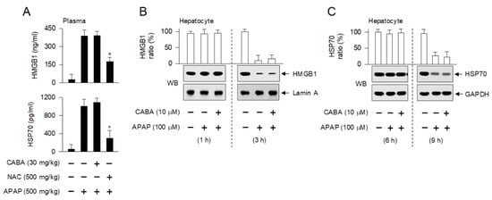 Effect of CABA on the release of DAMPs such as HMGB1 and HSP70. (A) C57BL/6 mice were treated with CABA at 1 h after APAP overdose. Blood samples were prepared at 15 h, and used to measure the levels of HMGB1 and HSP70. * p < 0.05 vs. APAP alone. (B,C) Primary hepatocytes were pretreated with CABA for 2 h and stimulated with APAP for the indicated time-points in the presence of CABA. Protein extracts were subjected to Western blot (WB) analysis with anti-HMGB1 or anti-lamin A antibody (B) and anti-HSP70 or anti-GAPDH antibody (C). Ratio (%) represents the relative intensity of signals in the WB.