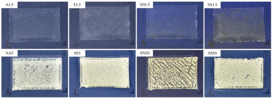 The type B composition was created by adding 12.5% PVA stock solution to the xanthan gum stock solution. This mixture was left until homogenized, and the porogen addition under constant stirring was the final preparation step. Three bottom and two top layers were printed in the type B composition samples to compensate for the fact that the top layers contain only loosely bound porogen particles and cannot effectively add to the overall mechanical properties of the ODFs. The type B composition samples are marked by “X”, followed by the utilized porogen abbreviation plus its concentration within the sample. In this case, only two distinct concentrations of the respective porogen were used. The type B composition thus involves 14 samples.