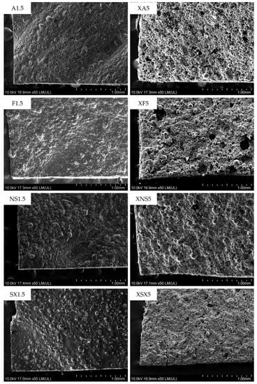 The type B composition ODF samples with the lower amount of A, NS, and SX (2.5%) possessed the highest TS (Table 3), falling into the region of TS outlined by Gupta et al. as acceptable [30]. The other samples (except XF5) exhibited TS in the range between 1 and 2 N/mm2 and could be considered acceptable if the effect of the porogenous top layer on the relative TS is accounted for.