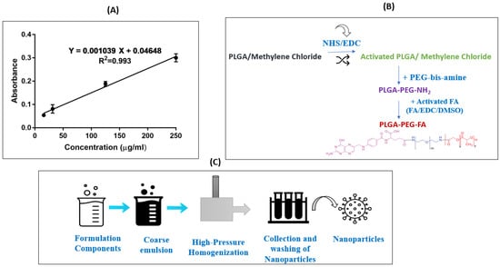 (A) Calibration curve for FA. (B) Schematics of PLGA conjugation with folic acid. (C) Graphical representation of nanoparticles’ preparation.