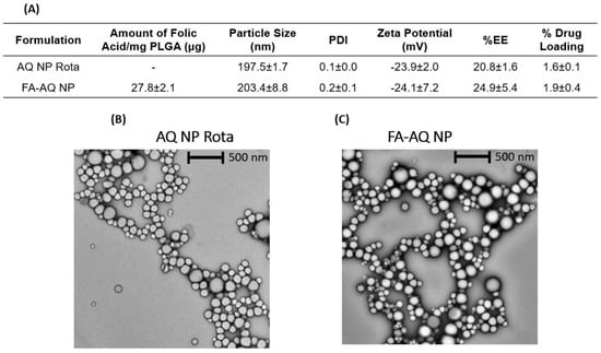 Representative TEM images of AQ NP Rota and FA-AQ NPs are presented in Figure 2B,C, revealing a spherical shape with a smooth surface for both nanoparticle formulations. No NP aggregation was observed during the TEM analysis, indicative of a relatively monodispersed size distribution of NPs in the formulation. The results were consistent with PDI and zeta potential values, as shown in Figure 2A.