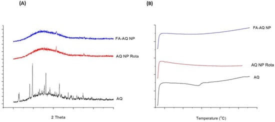 (A,B) Solid state characterization studies: (A) XRD patterns of AQ, AQ NP Rota, and FA-AQ NP; (B) Thermograms of AQ, AQ NP Rota, and FA-AQ NP.