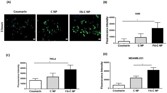 Quantification of Cellular uptake by Determining Fluorescence Intensity: The cellular uptake of FA-C NP, C NP, and coumarin by the A549, HeLa, and MDAMB-231 cells was quantified by microplate reader-based fluorescence assays. The cells were able to internalize individual treatments to a varied extent, as shown in Figure 5B–D. At the 3-h time point, the FA-C NP uptake was ~7.6, 2.6 (A549); ~2.3, 1.6 (HeLa); and ~5.7, 1.8 (MDAMB-231) times higher compared to plain coumarin and C NP, respectively. The fluorescence intensity of FA-C NP (23,230.7 ± 8927.8: A549; 37,276.0 ± 8773.1: HeLa; 42,113.3 ± 6115.8: MDAMB-231) treated cells was significantly higher when compared with C NP (9042.6 ± 5819.8: A549; 23,151.0 ± 7241.0: HeLa; 23,830.0 ± 4587.6: MDAMB-231) and coumarin (2991.3 ± 127.8: A549; 16,300.0 ± 3576.3: HeLa; 7434.0 ± 4431.6: MDAMB-231) at the 3-h time point (A549: coumarin vs. FA-C NP: p < 0.05; HeLa: coumarin vs. FA-C NP: p < 0.05; MDAMB-231: coumarin vs. FA-C NP: p < 0.05). The quantitative results indicate congruency to the fluorescence imaging, as shown in Figure 5A. Due to the presence of FA on the nanoparticle surface, the uptake of the FA-C NP into cells is enabled by the interaction between FA and the cell surface-expressed folate receptors, resulting in an elevated internalization in comparison to C NP and coumarin (A549) or plain coumarin (Hela, MDAMB-231). The presence of FA on NPs’ surface is associated with better uptake and significantly higher cytotoxicity in cancer cells, explaining the specificity of FA-mediated binding of conjugated NPs [44]. In addition, the anticipated process for the internalization of negatively charged nanoparticles could be endocytosis [42]. Recently, research work conducted by Angelopoulou et al. has demonstrated the superior ability of FA-conjugated pegylated magnetic NPs to deliver doxorubicin to cancer cells of solid tumors [45].