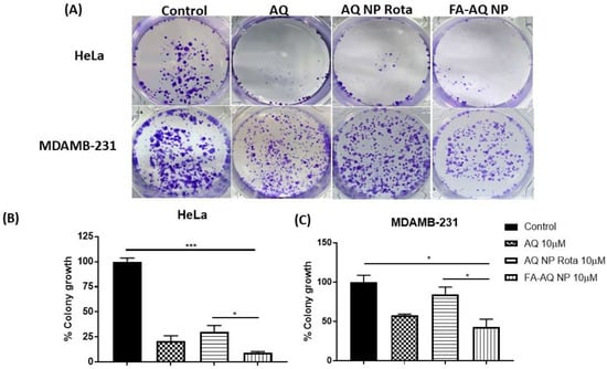 (A) Representative images showing distinct colonies after staining in HeLa and MDAMB-231 cell lines. Three different experiments were performed. (B,C) Quantitative representation of clonogenic assay as % colony growth with AQ, AQ NP Rota, and FA-AQ NPs treatment as compared to control in HeLa and MDAMB-231 cell lines, respectively. Data represent mean ± SEM (n = 3). * p < 0.05 and *** p < 0.001.