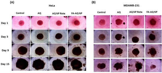 An effective targeted cancer treatment is not only defined by enhanced cellular uptake or cytotoxic potential, but also by the enhanced penetrability of targeted nanoparticles into solid cancer cell masses. Three-dimensional spheroid cell culture studies are capable of simulating the in vivo characteristics of tumors, as reported in our previous studies [40]. The HeLa and MDAMB-231 cell lines were used in this assay. Briefly, 2000 cells/well were seeded in a Corning® ultra-low attachment spheroid 96-well plate (Corning, NY, USA) and were incubated overnight at 37 °C/5% CO2 (Day 0). After 3 days of growth, all the spheroids were observed for spheroid formation with a rigid margin. The images were obtained using an inverted microscope at 10× magnification (Laxco, Mill Creek, WA, USA). The next day (Day 0 of treatment), half of the media was replaced with either the media (control) or the corresponding AQ, AQ NP Rota, or FA-AQ NP treatments (20 μM treatment used to maintain initial 10 μM treatment employed in the beginning), and images were obtained. In total, 100 µL of media was replaced with fresh media on further days of imaging. The images were captured on day 1, 3, 6, and 9, 12, and 15 days following treatment. ImageJ software (Version 1.44) was employed to calculate the diameters and the volumes of all spheroids.