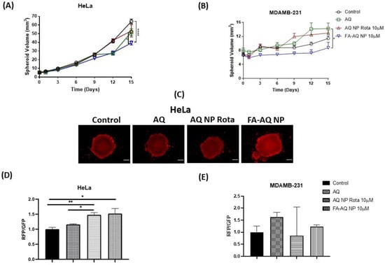 Defining viable and dead cells within a solid spheroid mass can be carried out by live-dead cell assay. Developed drug-loaded nanocarriers enable drug’s entry into the inner core of the tumor while 2D tumor volume measurements may not reveal a nanoformulation’s efficacy in penetrating the tumor core, as the spheroid masses consist of dead cell cores surrounding the structural periphery [7,56]. Three-dimensional spheroids are also grown over an extended period, with intratumoral core zones being exposed to environmental conditions, such as lack of O2, and nutrients, developing necrotic and quiescent cells in the core regions [56]. Therefore, it is essential to quantify actual dead cell portions out of a spheroid mass. Figure 9C,D represents terminal spheroid images on day 15 after treatment and the quantification plot of red fluorescence intensity, respectively. While AQ NP Rota and FA-AQ NP treatments demonstrated a reduction in the tumor volume, higher red fluorescence (dead cells) was seen with the FA-AQ NP treatment in the case of HeLa spheroids, as seen in Figure 9D. The ratio of red fluorescence protein (RFP) to green fluorescence protein (GFP) comparison on day 15 of the single dose (FA-AQ NP) post-treatment period revealed that RFP/GFP is 1.5-, 1.4-, and 1.3-folds higher in comparison to the control, AQ, and AQ NP Rota (control vs. FA-AQ NP: p < 0.05, control vs. AQ NP Rota: p < 0.01). These results indicate a higher red fluorescence comparatively in the case of FA-AQ NP treatment, which could be due to the targeting potential of FA-conjugated NPs to penetrate spheroids and exhibit their anti-cancer efficacy. Figure 9E represents the plot for RFP/GFP against AQ, AQ NP Rota, and FA-AQ NP treatments in MDAMB-231 cells.