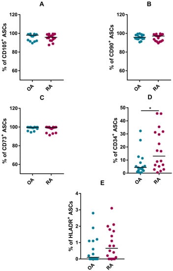 Figure 1. Phenotype of ASCs from RA and OA patients. Plots demonstrate the percentages of RA- and OA-ASCs expressing a given surface protein: CD105 (A), CD90 (B), CD73 (C), CD34 (D), HLADR (E). Results are shown as single values (dots) and medians (line). A p value is expressed as follows: 0.05 > p > 0.01 as *.