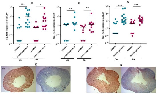 Figure 2. Chondrogenic differentiation of ASCs. The expression of selected chondrogenesis markers at the mRNA level in ASCs cultured in DMEM/F12 medium and in chondrogenic medium was assessed by RT–qPCR (AC). Alcian blue staining of pellet scrapings showing deposition of extracellular matrix glycosaminoglycans. The photograph shows the representative staining results of ASCs from OA patients (D) and RA patients (E). Individual values (circles and squares) and medians a (black line) are shown in the figure. p values are expressed as follows: 0.05 > p > 0.01 as *; 0.01 > p > 0.001 as **; p < 0.001 as ***.