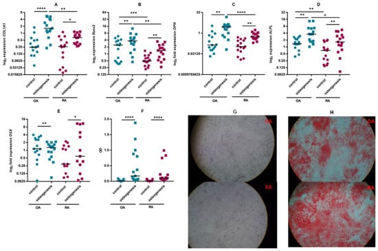 Figure 3. Differentiation of ASCs towards osteoblasts. The expression of selected osteogenesis markers at the mRNA level in cells cultured in DMEM/F12 medium and in osteogenic medium was assessed by RT-qPCR (AE). Staining of cells with Alizarin Red S highlighting calcium deposition. The red dye was extracted and its concentration assessed spectrophotometrically (F). The photographs show representative cultures of unstained ASCs (G) and ASCs stained with Aizarin Red S (H) after osteogenic differentiation. Individual values (circles and squares) and medians (black line) are shown in the figure. p values are expressed as follows: 0.05 > p > 0.01 as *; 0.01 > p > 0.001 as **; p < 0.001 as ***; p < 0.0001 as ****.