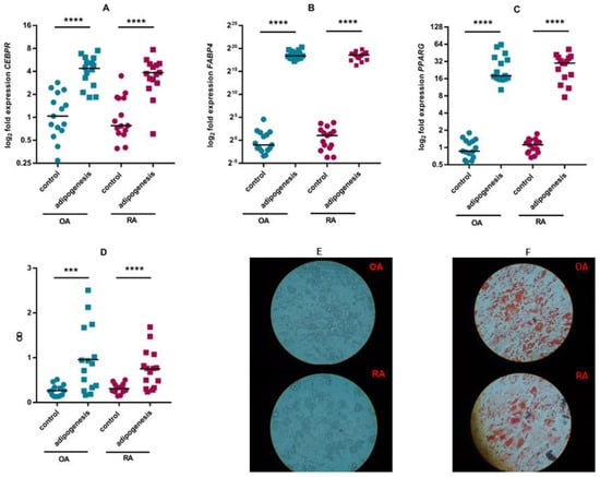 Figure 4. Differentiation of ASCs towards adipocytes. The expression of selected adipogenesis markers at the mRNA level in cells cultured in DMEM/F12 medium and in adipogenic medium was assessed by RT–qPCR (AC). Fat droplets in the cytoplasm were stained using Oil Red O. The red dye was extracted and its concentration was assessed spectrophotometrically (D). The photographs show representative ASC cultures before (E) and after staining with Oil Red O (F). Individual values (circles and squares) and medians (black line) are shown in the figure. p values are expressed as follows: p < 0.001 as ***; p < 0.0001 as ****.