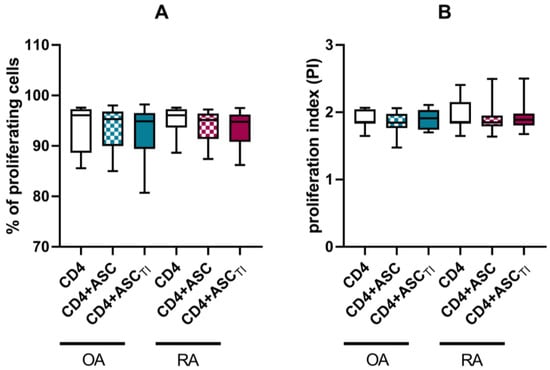 A different effect was observed when PBMCs were co-cultured with ASCs. PHA-stimulated PBMC T lymphocytes proliferated vigorously. In the co-culture with ASCs, a statistically significant decrease in the percentage of proliferating PBMCs, as well as a decrease in the PI, was observed (Figure 6). Prestimulation of ASCs with TI did not exacerbate the inhibitory effect of ASCs. No significant changes were observed between the effect exerted by cells obtained from RA and OA patients.