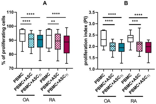 Figure 6. Proliferation of PMBCs co-cultured with ASCs of OA patients or RA patients. PBMCs obtained from healthy donors were stimulated with PHA. PBMCs were cultured alone (control) or co-cultured for 5 days with either untreated or TI-stimulated ASCs. The proliferation was assessed as percentage of proliferating cells (A) or proliferation index (B). p values are expressed as follows: 0.01 > p > 0.001 as **; p < 0.001 as ***; p < 0.0001 as ****.