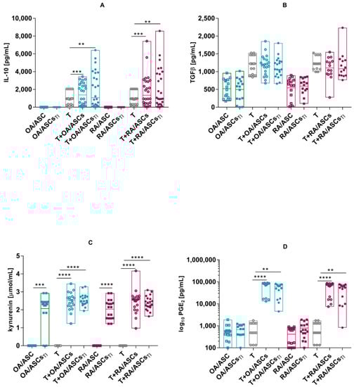 Figure 7. Concentrations of IL-10 (A), TGFβ (B), kynurenine (C) and PGE2 (D) in the co-cultures of OA- (teal signs) or RA-ASCs (red signs) with αCD3CD28-activated T cells. Data are shown as single values with box representing 25th and 75th percentiles and medians as lines. p values are expressed as follows: 0.01 > p > 0.001 as **; p < 0.001 as ***; p < 0.0001 as ****.