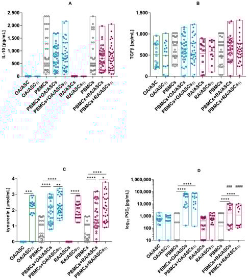 Figure 8. Concentrations of IL-10 (A), TGFβ (B), kynurenine (C) and PGE2 (D) in the co-cultures of OA- (teal signs) or RA-ASCs (red signs) with PHA-activated PBMCs. Data are shown as single values with box representing 25th and 75th percentiles and, medians as lines. p values are expressed as follows: 0.05 > p > 0.01 as *; 0.01 > p > 0.001 as **; p < 0.001 as ***; p < 0.0001 as **** for comparisons of cell co-cultures versus separate control cultures. p < 0.001 as ###; p < 0.0001 as #### for the groups of OA patients versus RA patients comparison.