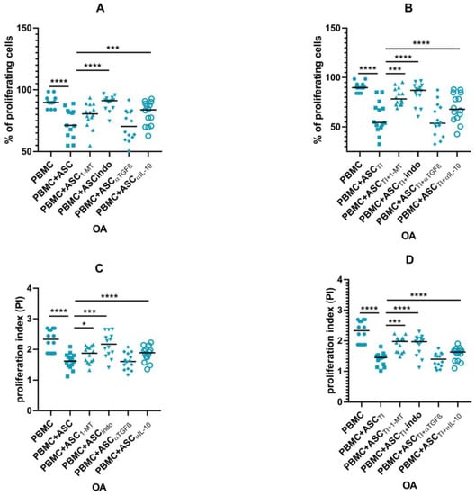Figure 9. Effects of selective inhibition of kynurenines (with 1-MT), PGE2 (with indomethacin), IL-10 neutralisation or TGFβ neutralisation on proliferation of PBMCs co-cultured with OA-ASCs. The proliferation is presented as percentage of proliferating cells (A,B) or proliferation index (C,D). p values are expressed as follows: 0.05 > p > 0.01 as *; p < 0.001 as ***; p < 0.0001 as ****.