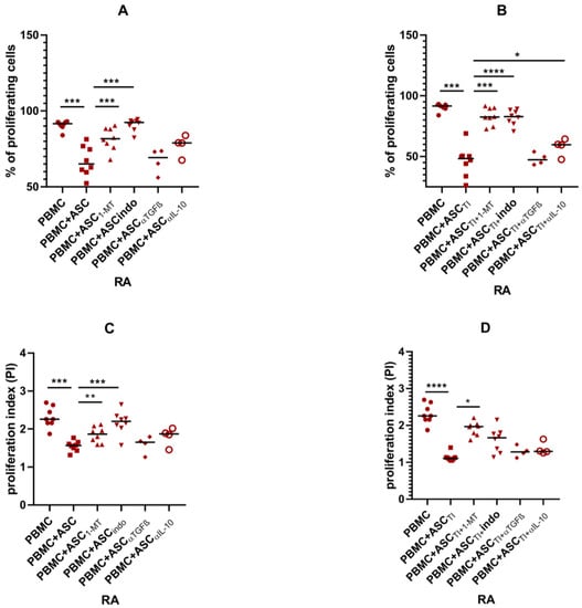 Figure 10. Effects of selective inhibition of kynurenines (with 1-MT), PGE2 (with indomethacin), IL-10 neutralisation or TGFβ neutralisation on proliferation of PBMCs co-cultured with RA-ASCs. The proliferation is presented as percentage of proliferating cells (A,B) or proliferation index (C,D). p values are expressed as follows: 0.05 > p > 0.01 as *; 0.01 > p > 0.001 as **; p < 0.001 as ***; p < 0.0001 as ****.