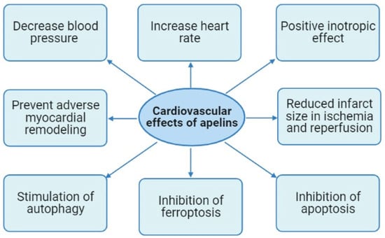 It was reported that apelin-13 can decrease blood pressure (BP) and increase heart rate (HR) [28,29,30,31,32,33] (Figure 2).