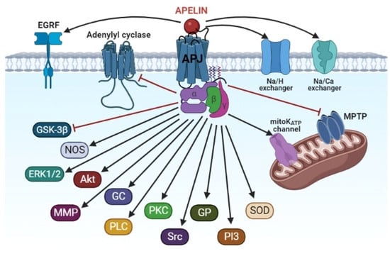 The cardioprotective effect of apelins in I/R of the heart is accompanied by blockage of the MPT pore and the activation of PI3-kinase, Akt, ERK1/2, NOS, SOD, glutathione peroxidase, MMP, EGFR, Src kinase, the mitoKATP channel, GC, PLC, PKC, the Na+/H+ exchanger, and the Na+/Ca2+ exchanger (Figure 3).