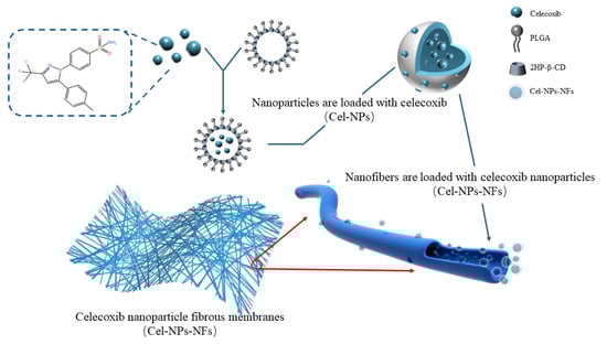 In this study, a drug delivery system using polylactic acid-hydroxyacetic acid copolymer (PLGA) nanoparticles and polyvinyl alcohol (PVA) was developed for intra-articular implantation of celecoxib nanoparticle fibrous membranes (Cel-NPs-NFs) by electrostatic spinning. The system was first prepared using PLGA and 2-HP-βCD as carriers by emulsifying solvent volatilization to produce drug-loaded nanoparticles (Cel-NPs). Next, the nanoparticles were mixed with a polymer solution and then encapsulated in nanofibers using electrostatic spinning technology. During this process the polymer solution mixed with nanoparticles is injected through a needle to produce a highly expanded and curved fluid jet and the dispersed phase tends to collect in the center of the fluid. The elongation effect of the fluid in the air helps the nanoparticles to settle inside the fibers rather than on the surface [,]. This results in a nanofiber film with most of the drug-laden nanoparticles uniformly dispersed inside the fiber, as shown in Figure 1. This paper focuses on verifying the feasibility of this drug delivery system, characterizing its physicochemical properties, assessing its cell uptake in the RAW264.7 cell model in vitro, and verifying the function of the drug delivery system in the SD rat knee joint OA model in vivo.
