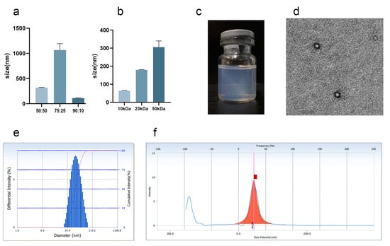 Nanoparticles can increase the amount of drugs delivered into inflammatory synovial tissues and are more advantageous than microspheres and other particle drug delivery systems []. The copolymerization ratio and molecular weight properties of PLGA are the key factors affecting the formation of nanoparticles. In the experiment, the molecular weight of PLGA was 1 w, and the differences of D90 under different copolymerization ratios (50:50, 75:25, and 90:10) were compared. As shown in Figure 2a, D90 was the smallest when the copolymerization ratio of PLGA was 90:10; therefore, the copolymerization ratio of PLGA was 90:10 to achieve a smaller particle size. When the copolymerization ratio was 90:10, the average particle size was used as the evaluation index to investigate the effect of different molecular weights (10, 23, and 50 kDa) on the system. As shown in Figure 2b, the larger the molecular weight, the larger the average particle size. The NPs prepared on this basis were blue, clear, transparent, and stable (Figure 2c). The average particle size distribution was 74.23 ± 8.22 nm (Figure 2e), the polydispersion index was 0.175 ± 0.058, and the potential was −38.58 ± 5.64 mV (Figure 2f). The nanoparticles exhibited a spherical structure (Figure 2d). The nanoparticles were uniformly distributed, the particle size distribution was narrow, and the system was stable without precipitation and condensation.