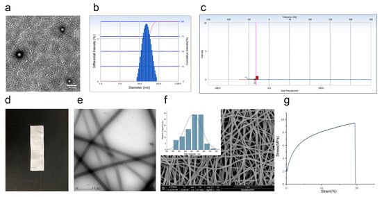 The characteristics of Cel-NPs-NFs; (a) Cel-NPs in nanofibers under a transmission electron microscope (scale: 200 nm); (b) Particle size distribution of Cel-NPs in nanofibers; (c) Potential distribution diagram of Cel-NPs in nanofibers (The red square on the x-axis is the potential value); (d) Cel-NPs-NFs appearance diagram; (e) Cel-NPs-NFs under a transmission electron microscope (scale: 1 µm); (f) Cel-NPs-NFs under a scanning electron microscope and diameter distribution of 100 fibers (scale: 5 µm); (g) Stress–strain curve of Cel-NPs-NFs.