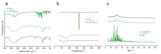 Discussion on the interaction mode of drugs and carriers IR, DSC, and X-RD; (a) Infrared characteristic map; (b) DSC curve; (c) X-ray diffraction pattern. (Cel, Cel-NPs and Cel-NPs-NFs).