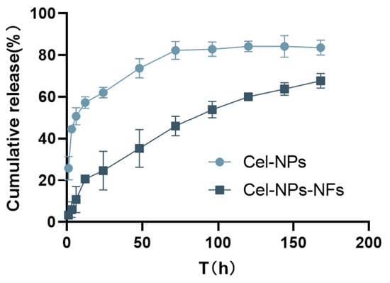 In vitro release curve of Cel-NPs and Cel-NPs-NFs in 168 h.