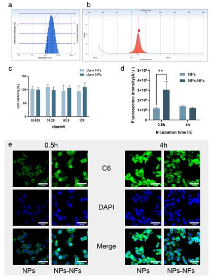Uptake of RAW264.7 cells by fluorescence confocal microscopy and flow cytometry; (a) Particle size distribution of C6-NPs; (b) Potential distribution of C6-NPs (The red square on the x-axis is the potential value.); (c) Cytotoxicity study of blank preparation CCK8; (d) Fluorescence uptake analysis of flow cytometry at 0.5 h (** means p < 0.01) and 4 h; (e) Observation of cell uptake at 0.5 h and 4 h under confocal fluorescence (scale: 30 µm); C6 green fluorescence indicates the state of uptake instead of the model drug as a probe. The DAPI-stained nuclei are blue. Merge indicates the whole uptake state.